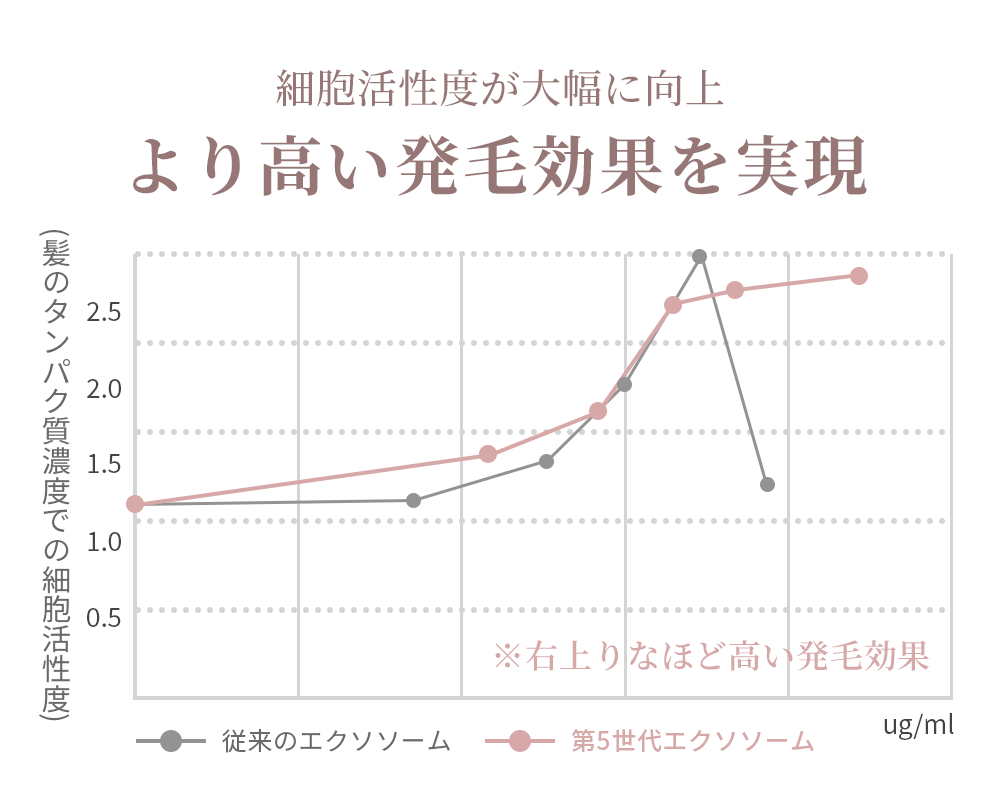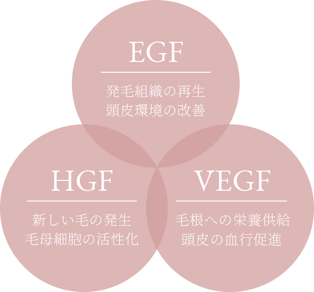 発毛・血管新生・細胞再生に欠かせない成長因子「HGF」「VEGF」「EGF」をはじめ、2000種類以上の生理活性物質(サイトカイン等)が高濃度で含まれており、従来の細胞培養液に比べ約30〜50倍の成長因子含有量を誇ります。そのため、毛包幹細胞に直接働きかけて発毛を強力に促します。