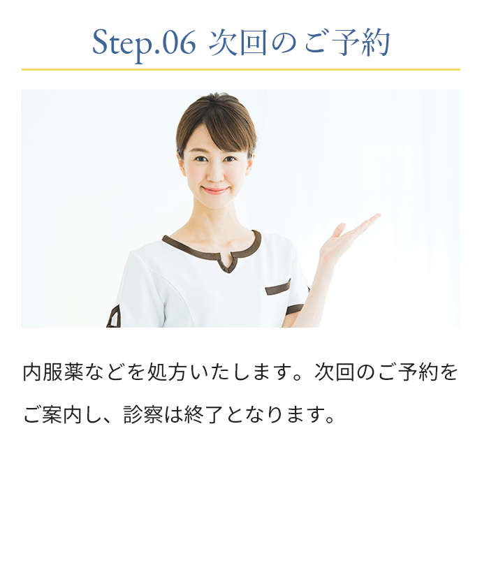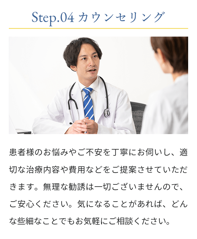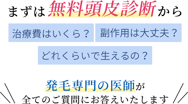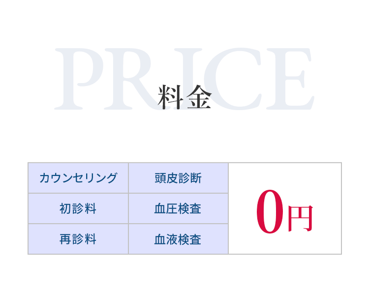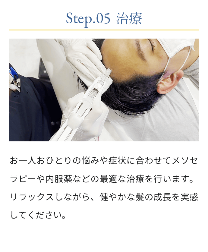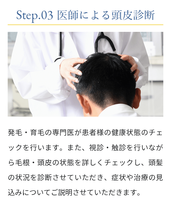 現在の体調や頭皮・頭髪の状態、お悩みやご不安を丁寧にお伺いし、視診・触診を通じて薄毛のタイプや進行度を確認いたします。その上で、最適な治療方針や治療薬についてご説明いたします。